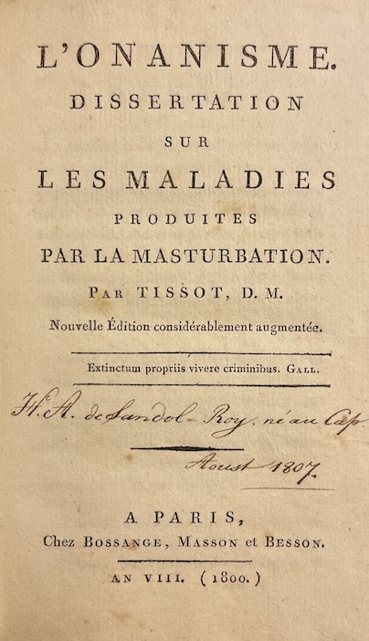 TISSOT (Samuel Auguste André David) L’onanisme. Dissertation sur les maladies produites par la masturbation. A Paris, cher Bossange, Masson et Besson, An VIII (1800).