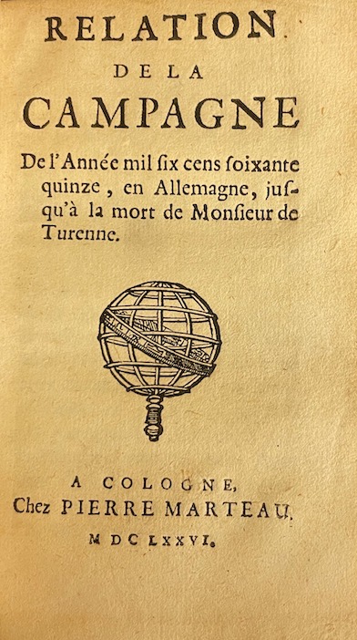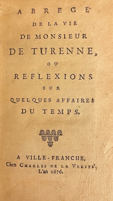 ![[TURENNE (Henri de la Tour d'Auvergne de)] Abrégé de la vie de Monsieur de Turenne, ou réflexions sur quelques affaires du temps. [avec relié à la suite] Relation de la campagne de l'année mil sic cens soixante quinze, en Allemagne, jusqu'à la mort de Monsieur de Turenne. A Ville-Franche, chez Charles de la Vérité, 1676 & Cologne, Pierre Marteau, 1676.](https://cabinetamateur.ch/wp-content/uploads/2025/11/32571_1.jpg)