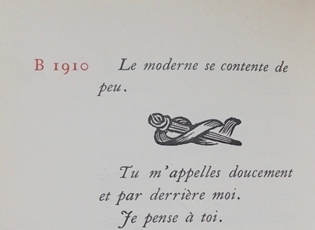 Edition numérotée 1/4000 exemplaires sur Alfa (après 50 ex. s/Japon). Illustré de vignettes in-texte. Belle typographie en 2 couleurs de Darantière. L’édition originale de ces textes fut publiée par Edouard Champion en petit nombre.