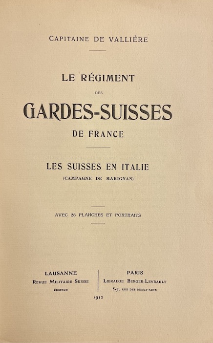 VALLIERE (Paul de, capitaine) Le régiment des gardes-suisses de France. Les Suisses en Italie (Campagne de Marignan). Lausanne, Revue Militaire Suisse & Paris, Berger-Levrault, 1912.