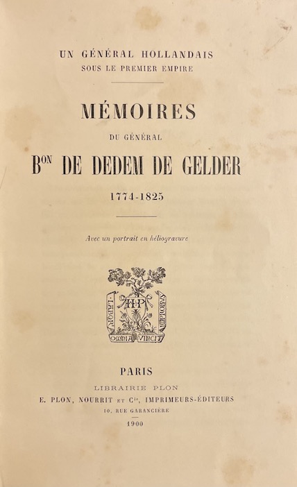 VAN DEDEM DE GELDER (Baron Antoine-Baudoin-Gisbert) Mémoires (1774-1825). Un Général hollandais sous le premier Empire. Paris, Plon, 1900.