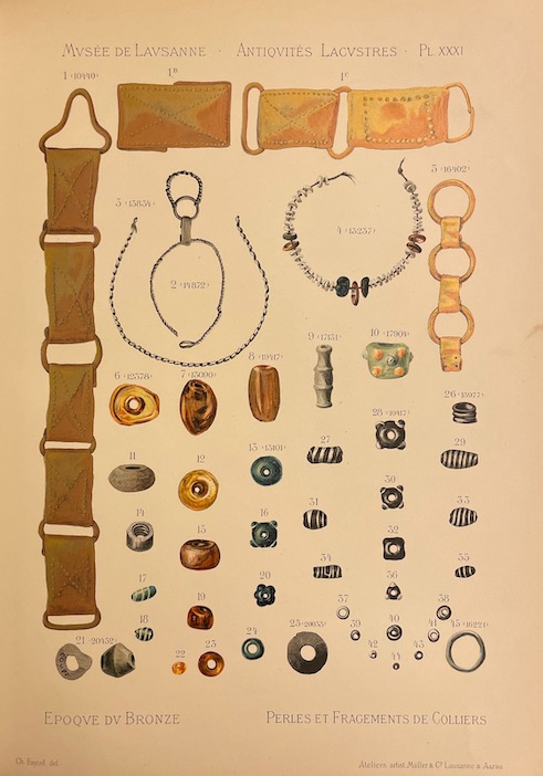 Edition originale. Album publié par la Société d’Histoire de la Suisse romande et la Société Académique vaudoise avec l’appui du Gouvernement vaudois. Précédé d’une notice sur les collections lacustres du Musée cantonal vaudois par B. van Muyden et d’un mémoire explicatif par H. Colomb. Avec une planche de titre et 41 planches rassemblant d’innombrables objets dessinés par Ch. Fayod. Ex-libris sur premier contreplat. Bel exemplaire.