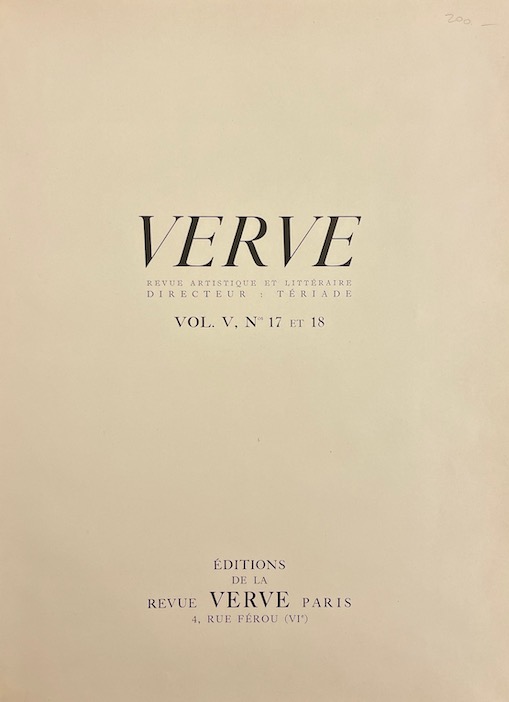 | Lieu d'éd. - Editions - Achevé d'imprime | Paris, Verve (Vol. V, N° 17-18), 1947. |