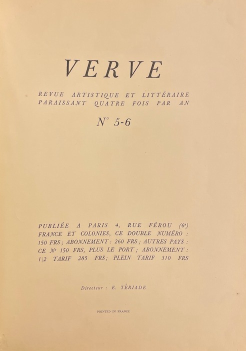 | Lieu d'éd. - Editions - Achevé d'imprime | Paris, Verve Volume II, N° 5-6. Juillet-Octobre [1939]. |