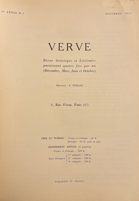 ![[VERVE] - Verve. Revue Artistique et Littéraire. Paris, Verve (Vol. I, N° 1), 1937. – Image 6](https://cabinetamateur.ch/wp-content/uploads/2025/11/41376_6.jpg)
