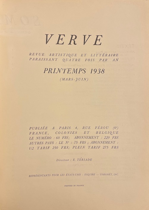 | Lieu d'éd. - Editions - Achevé d'imprime | Paris, Verve (Vol. I, N° 2), 1938. |