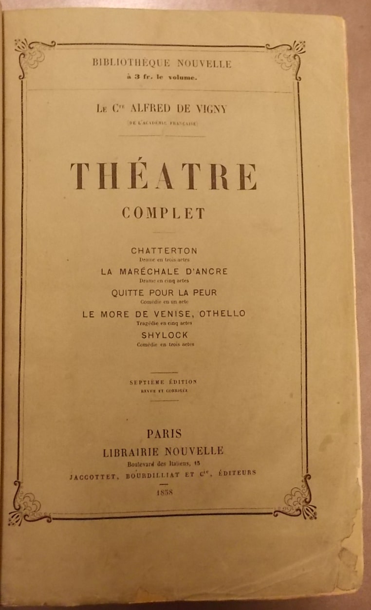 VIGNY (Alfred de) Théâtre complet. Chatterton – La Maréchale d’Ancre – Quitte pour la peur – Le More de Venise, Othello – Shylock. Paris, Librairie Nouvelle, 1858.