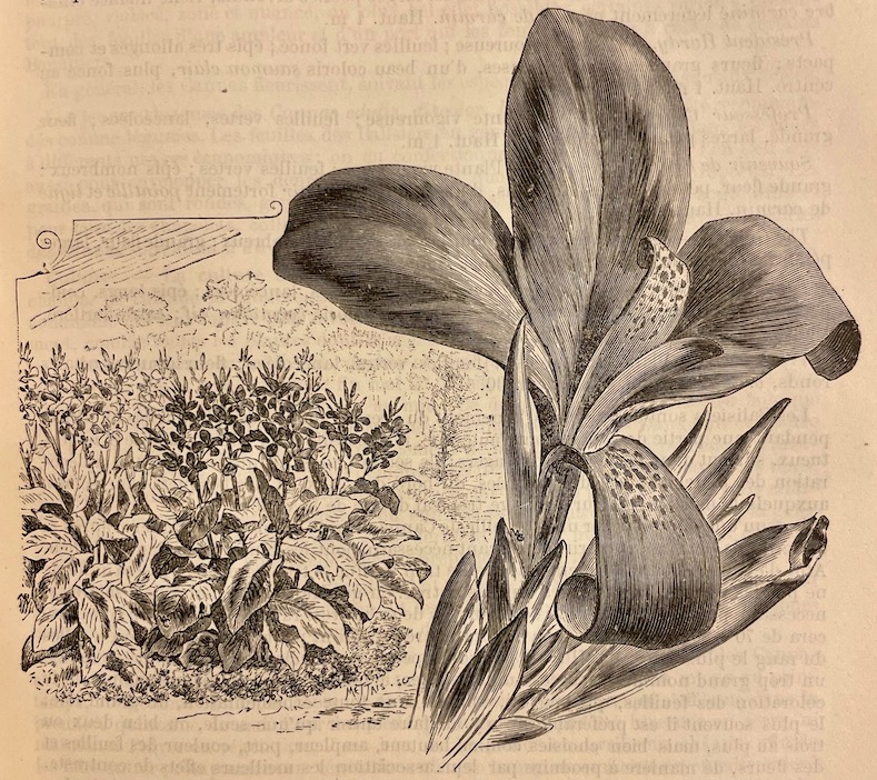 […]  comprenant la description et la culture des fleurs annuelles, bisannuelles, vivaces et bulbeuses de pleine terre; suivies de classements divers indiquant l’emploi de ces plantes et l’époque de leur semis ou plantation et de leur floraison; de nombreux exemples d’ornementation pour corbeilles, plates-bandes, etc… Ainsi que des plans de jardins et de parcs paysagers avec des notes explicatives et examples de leur ornementation par Edouard André.