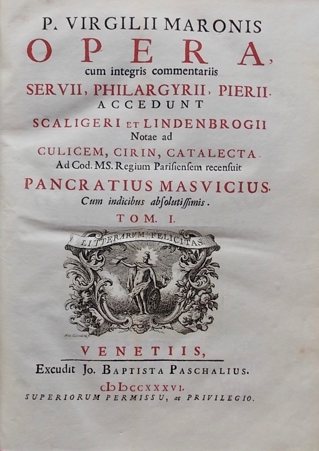 VIRGILE P. VIRGILII MARONIS OPERA.Cum integris commentariis Servii, Philargyrii, Pierii. Accedunt Scaligeri et Lindenbrogii Notae ad Culicem, Cirin, Catalecta. Ad Cod. Ms. Regium Parisiensem recensuit Pancratius Masvicius. Cum indicibus absolutissimis & figuris elegantissimis. Venetiis, Jo. Baptista Paschalius, 1736.