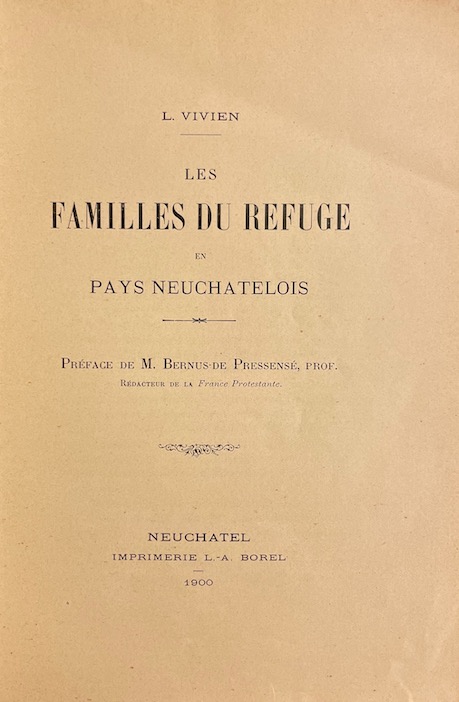 VIVIEN (L.) Les familles du Refuge en Pays Neuchâtelois. Neuchâtel, Imprimerie Borel, 1900.