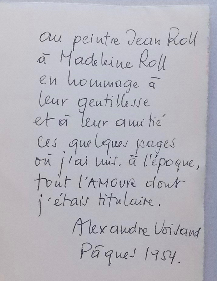 Edition originale du premier recueil d’Alexandre Voisard. Exemplaire enrichi d’un très bel envoi autographe signé de l’auteur au peintre Jean Roll en page de faux titre. Couverture légèrement jaunie et piquée et une tache de peinture sur les pages 6 et 7. Autrement bon exemplaire, fort peu courant.
