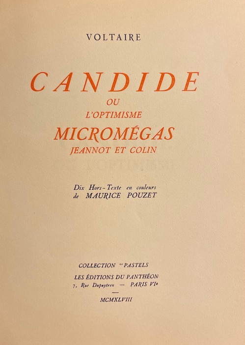 VOLTAIRE Candide ou l’optimisme – suivi de: Micromégas et de Jeannot et Colin. Paris, Ed. du Panthéon (coll. Pastels), 1948.