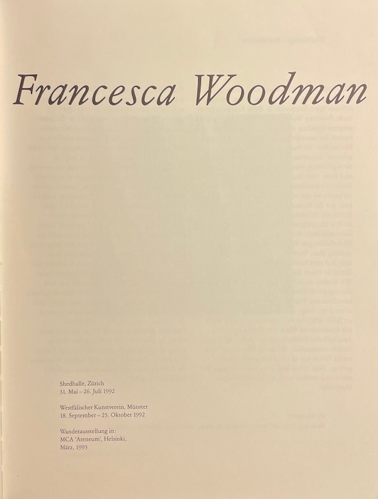 [WOODMAN Francesca] Francesca Woodman. Photographische Arbeiten – Photographic Works. Zürich, Stedhalle, 1992