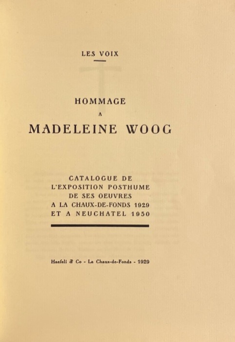 [WOOG] – Revue LES VOIX Hommage à Madeleine Woog. Catalogue de l’exposition postume de ses oeuvres. La Chaux-de-Fonds, Haefeli & Co, 1929.