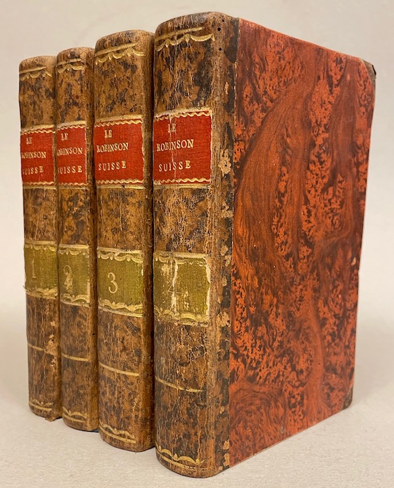 Edition originale très rare de la première traduction française dûe à Madame de Montolieu et qui fut publiée un an après l’édition originale en allemand. Illustré de 12 planches hors texte de Chasselat gravées par Gauthier et d’une carte dépliante de l’île déserte. Menues traces d’usage aux reliures, déchirure en tête de la page 255 du premier volume, mouillures claires en coin supérieur des dernières pages du second volume. Néanmoins bon exemplaire.