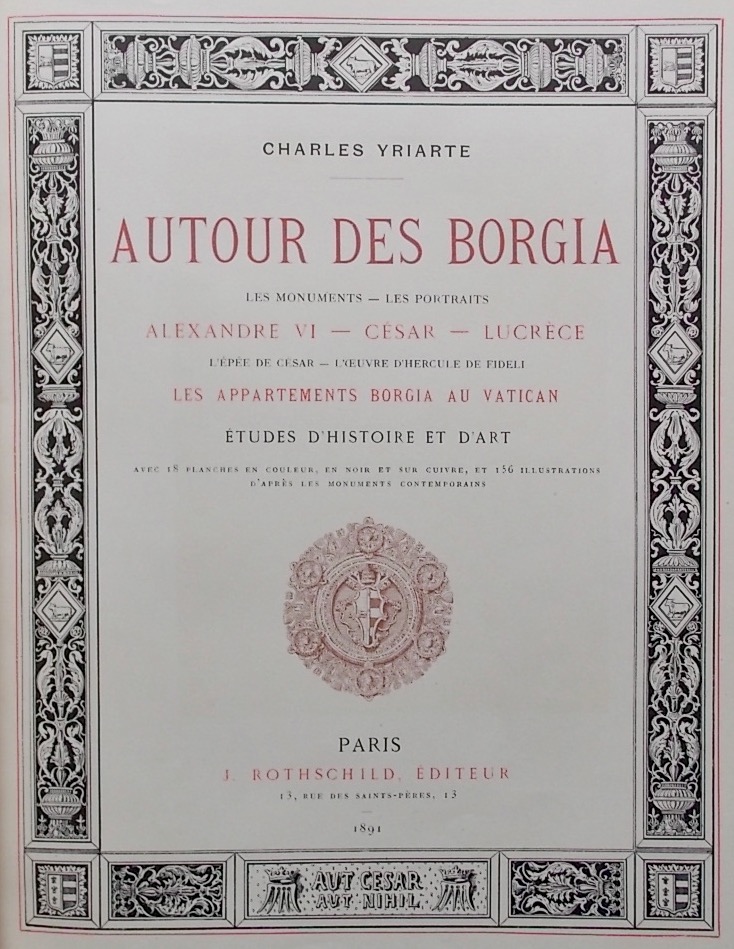 YRIARTE (Charles) Autour des Borgia. Les monuments – Les portraits – Alexandre VI – César – Lucrèce – L’épée de César – L’oeuvre d’Hercule de Fideli – Les appartements Borgia au Vatican. Etudes d’histoire de l’art. Paris, J. Rothschild, 1891.