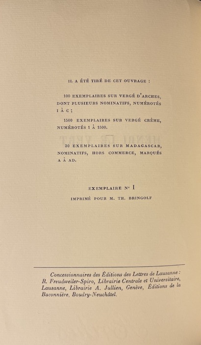 Edition originale. Un des 100 exemplaires de tête numérotés en chiffres romains sur vergé d’Arches de la traduction française de Jean-Paul Zimmermann. Celui-ci: exemplaire n° I imprimé pour M. Th. Bringolf !!! Préface de Charly Clerc. Très bel exemplaire